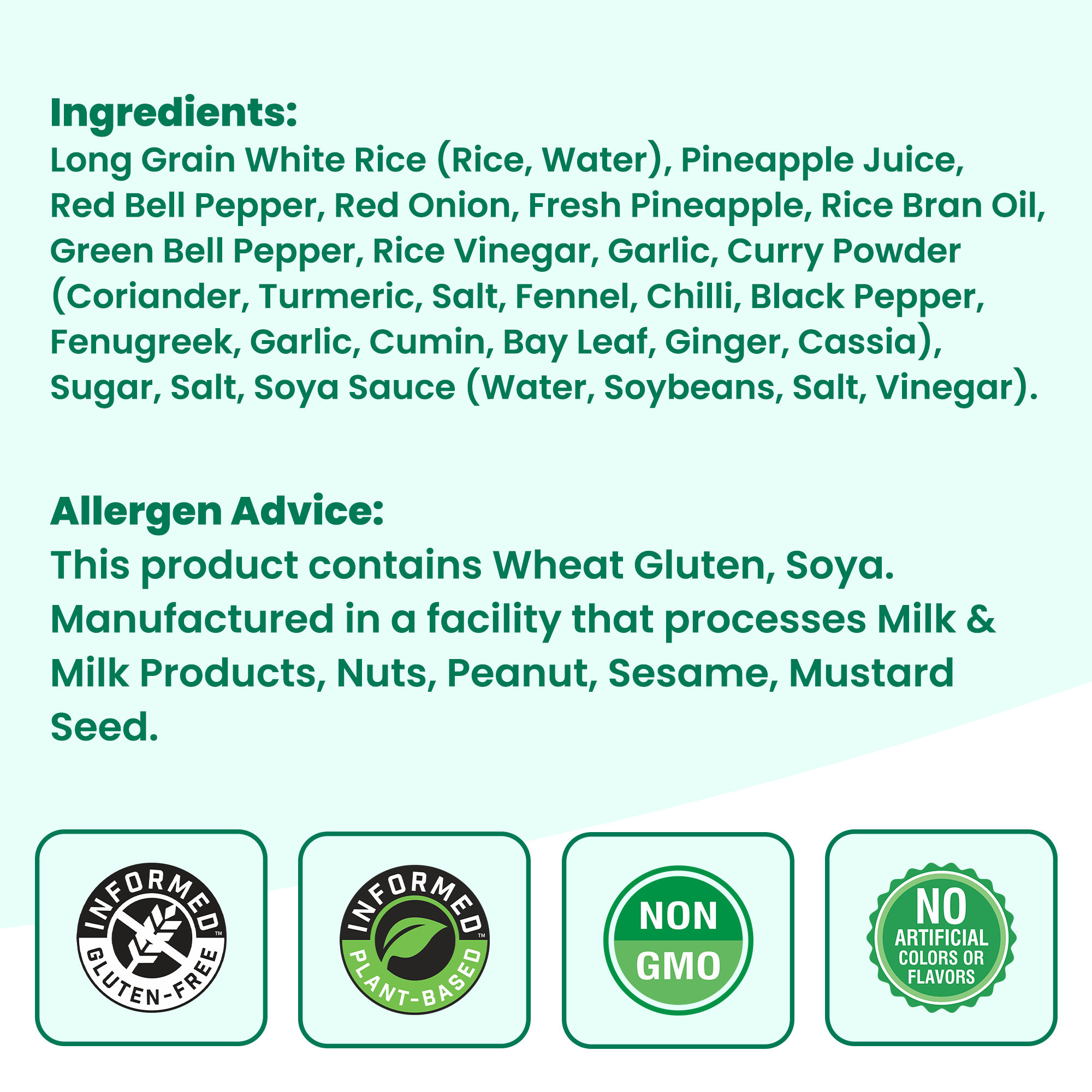 Cooked rice, pineapple pieces, red bell peppers, garlic, vegetable oil, salt, spices, and natural seasonings.