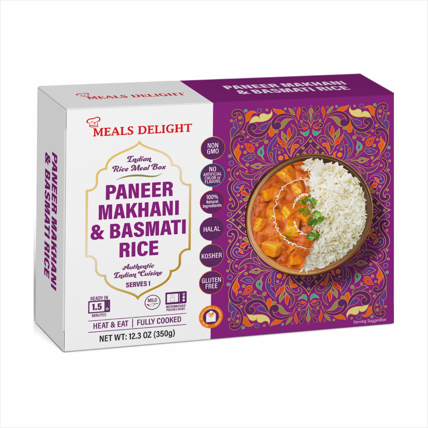 - Ready in Just 1.5 Minutes: Heat the meal in 1.5 minute. No boiling or additional cooking required. This ready-to-eat box contains a classic serving of Paneer Makhani and Basmati rice, prepared with 100% natural ingredients and zero preservatives. It is shelf-stable and requires no refrigeration, making it a quick and easy vegetarian meal solution.